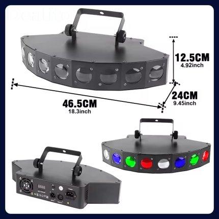 Le projecteur LED 8 yeux RGBW 4 en 1, offrant une luminosité élevée, un contrôle DMX512, et une faible consommation d’énergie. Idéal pour soirées, mariages et événements.
